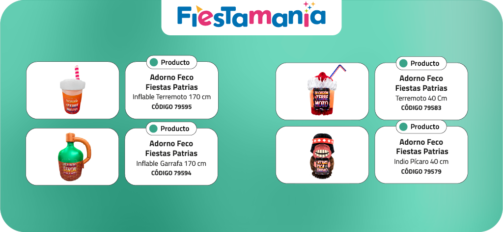 Visita el sitio web de PRISA ahora, encuentra los productos correspondientes a los códigos referidos (79595, 79594, 79579 y 79583), que incluyen el icónico indio pícaro y otros adornos inflables y decoraciones patrias. Analiza cuáles se adaptan mejor a tus espacios, solicita cotización para cantidades empresariales y agenda tu entrega. Tu equipo, tus clientes y todo septiembre te lo agradecerán.